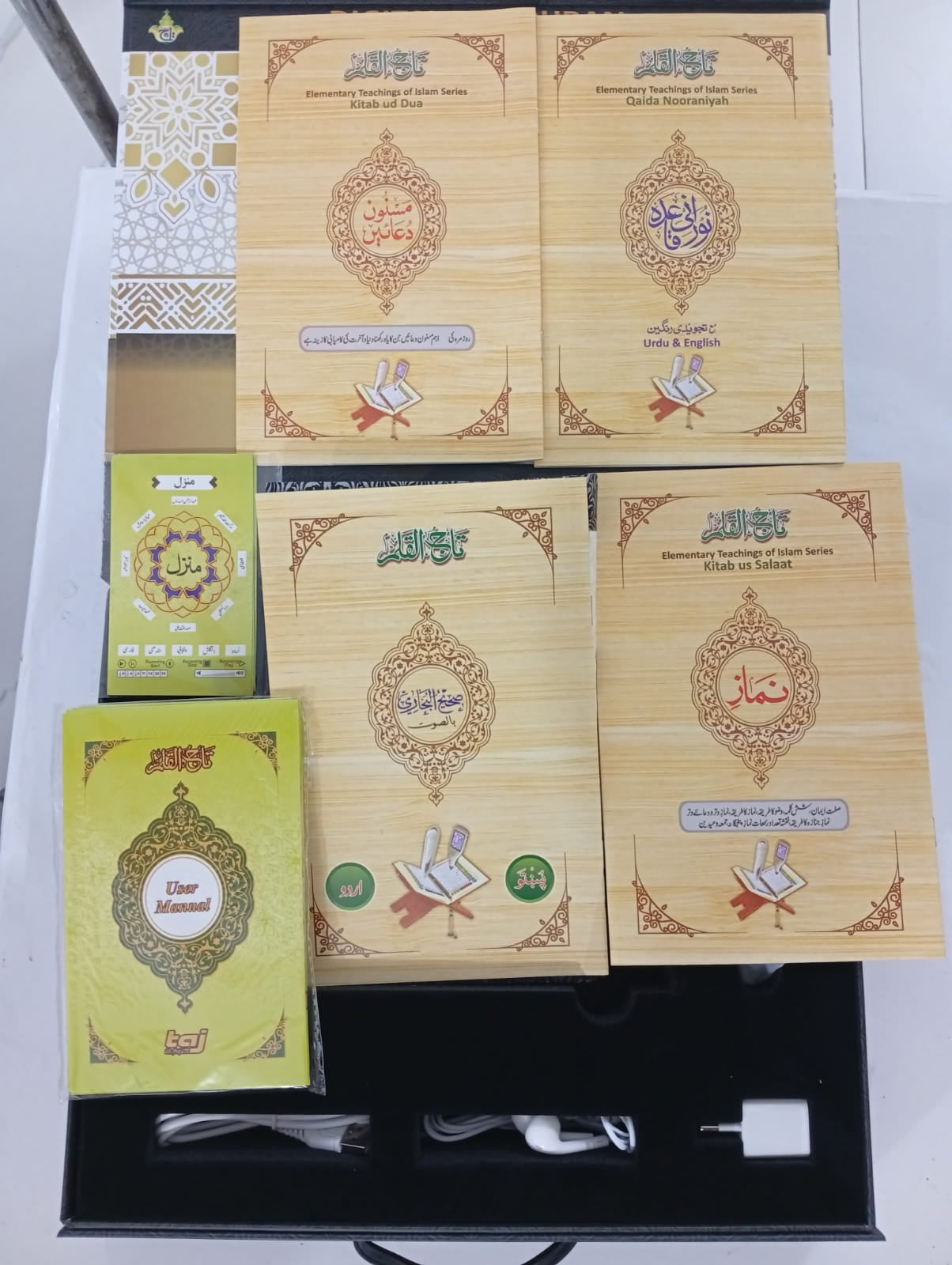 Experience the most complete and premium Digital Pen Quran by Taj Company, designed for easy learning, clear recitation, and lifelong use. This smart Quran pen brings together 27 world-famous Qaris, 10 international language translations, and 3 detailed Tafaseer, making it the perfect Islamic learning companion for all ages.