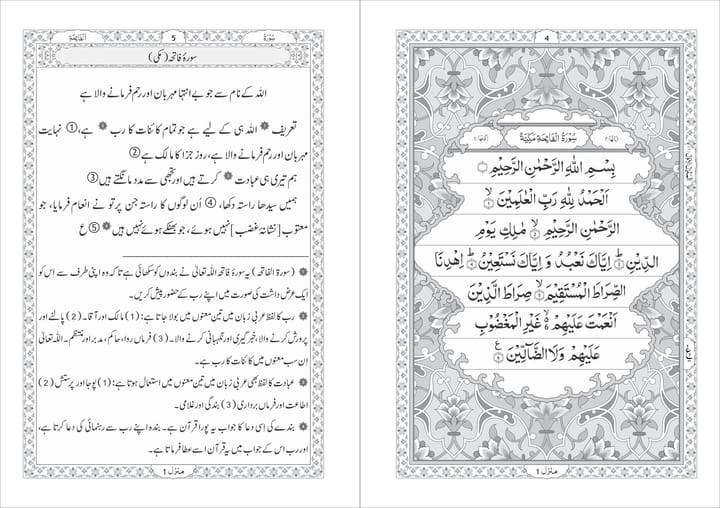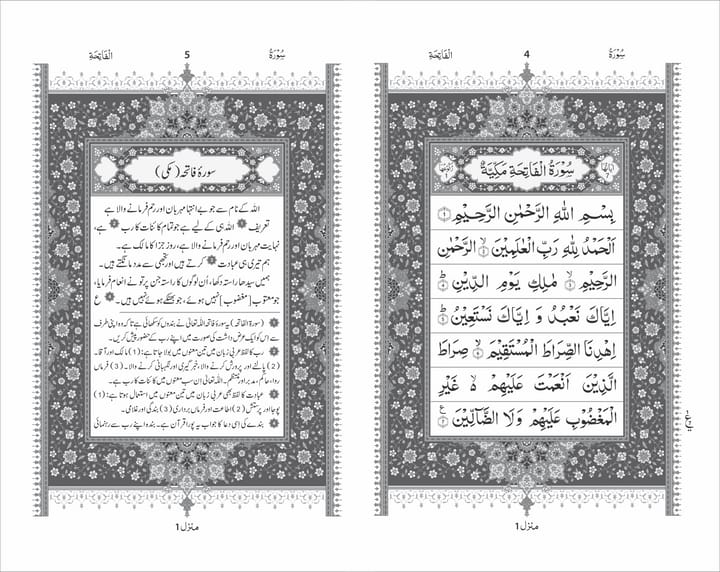 Dual-page format: One page in original Arabic text, the facing page with Urdu translation and tafseer for deeper understanding.